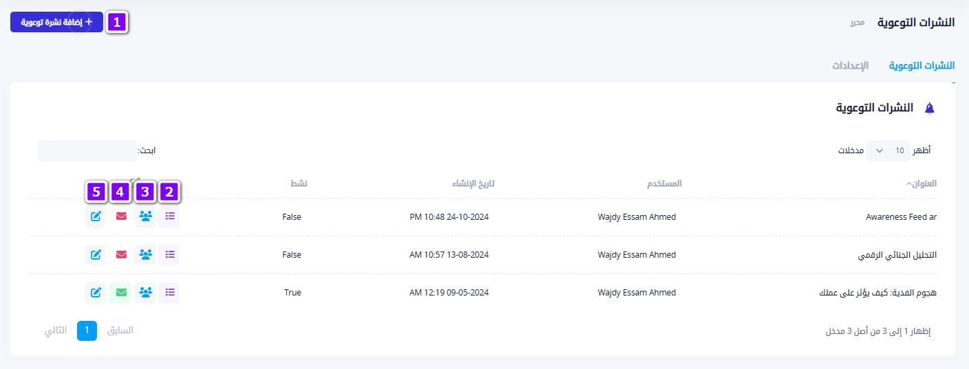 | 1 | زر إضافة نشرة توعوية | يُستخدم لإنشاء نشرة جديدة. يفتح نافذة لإدخال العنوان والمحتوى (باللغتين)، صورة الغلاف، فيديو، وتحديد الإدارات المستهدفة. |