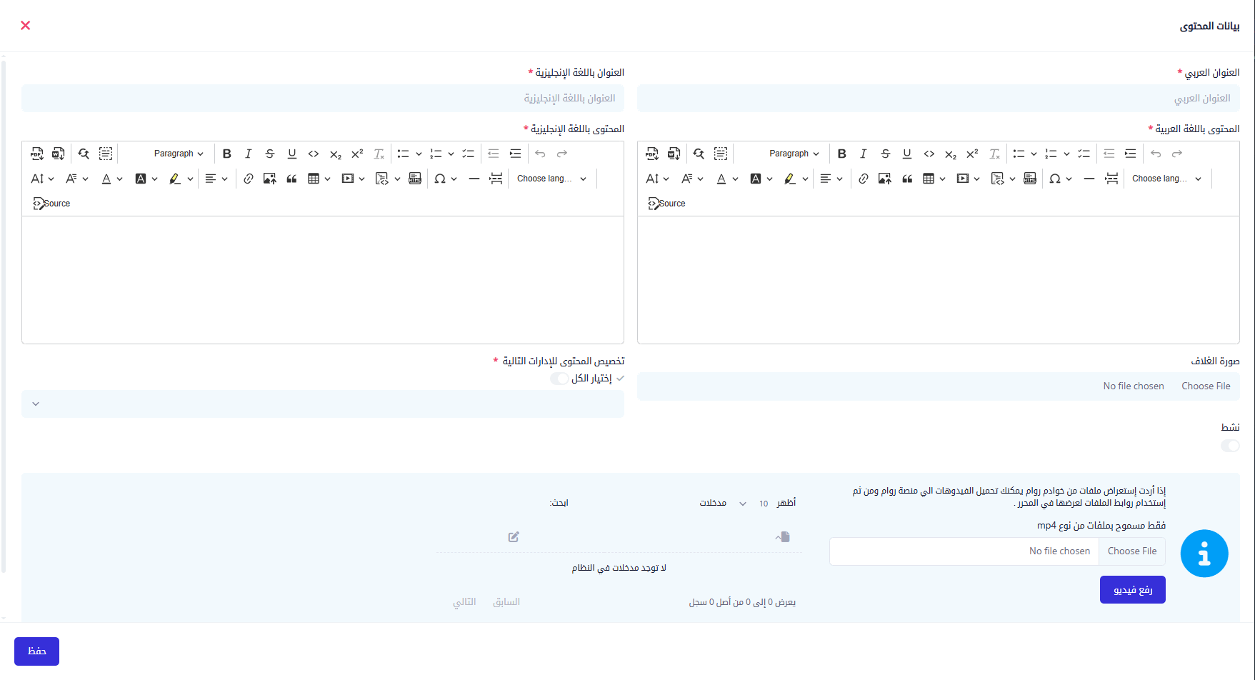 تُستخدم هذه النافذة لإنشاء أو تعديل نشرة توعوية جديدة. تحتوي على محررين للنصوص مخصصين لإدخال العنوان والمحتوى لكل من اللغتين العربية والإنجليزية. كما يمكن رفع صورة غلاف توضيحية للنشرة من خلال خيار "صورة الغلاف"، وتخصيص الإدارات التي ستُعرض لها النشرة باستخدام قائمة الإدارات الجانبية.