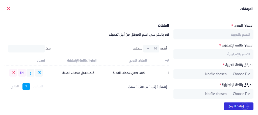 تُعرض المرفقات المُضافة في جدول يمكن من خلاله تعديل أو حذف المرفق، ويظهر اسم كل مرفق باللغة المخصصة له.