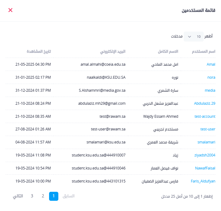 تعرض هذه الشاشة جميع المستخدمين الذين قاموا بمشاهدة النشرة التوعوية. تشمل الأعمدة اسم المستخدم في النظام، الاسم الكامل، البريد الإلكتروني، بالإضافة إلى تاريخ ووقت المشاهدة. تساعد هذه الشاشة المسؤول على متابعة مدى انتشار النشرة ومعرفة الفئة المستهدفة التي تفاعلت معها.