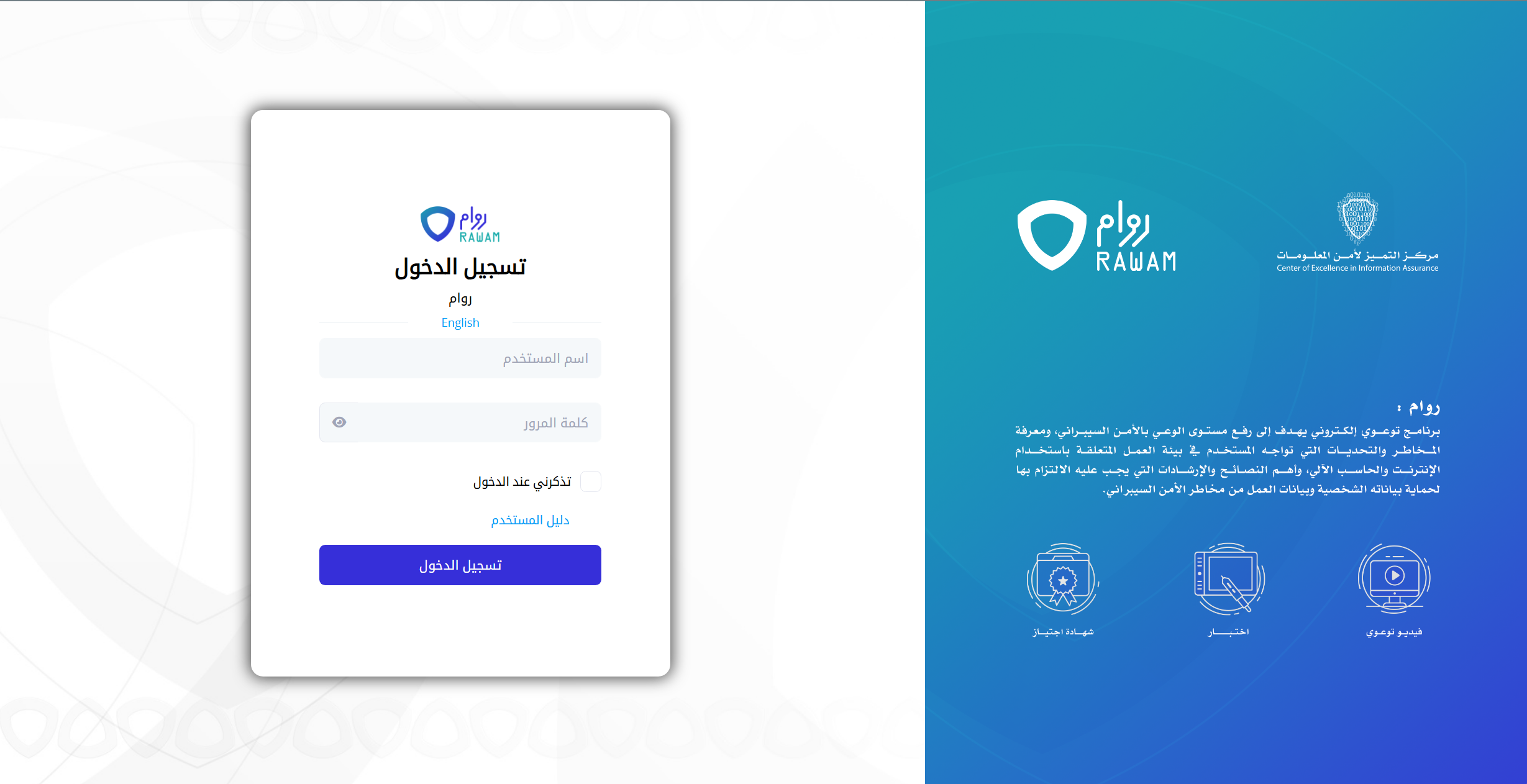 يبدأ المستخدم باستخدام منصة التوعية بتسجيل الدخول بحسابه الخاص، هذا الحساب قد يكون نفس حساب الويندوز المربوط بنظام المنشأة Windows LDAP Account أو يكون حساباً محلياً تم إنشاءه مسبقا في المنصة.