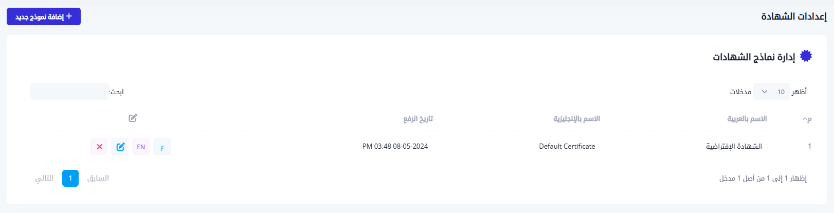 من خلال هذا القسم، يمكن إنشاء نموذج شهادة مخصص يُستخدم لإصدار شهادات تلقائية للمتدربين بعد اجتيازهم البرنامج التدريبي بنجاح.