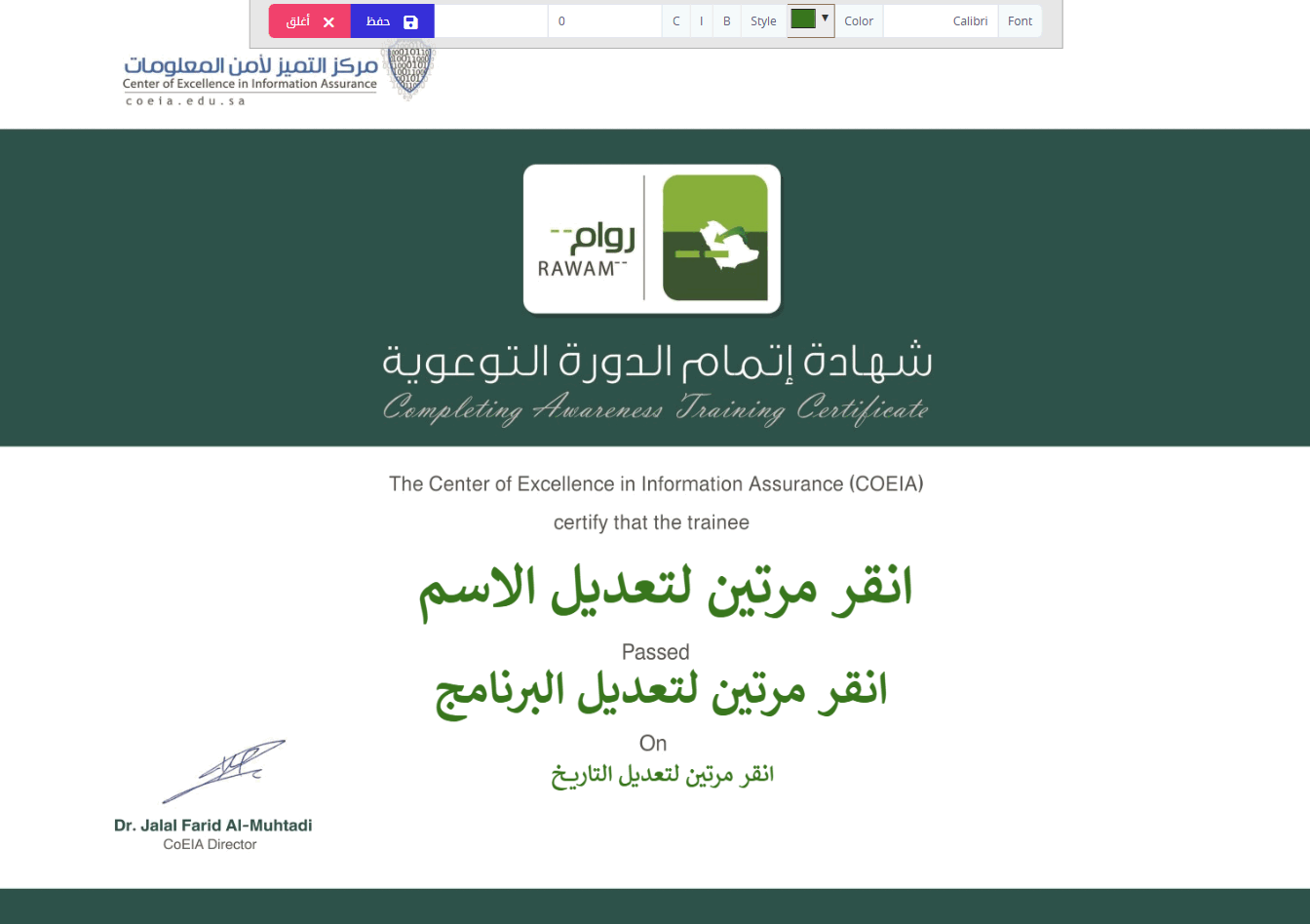 يُتيح قسم إعداد الشهادات للمسؤولين تصميم وتحميل نماذج الشهادات الخاصة بالبرامج التدريبية، سواء باللغة العربية أو الإنجليزية.