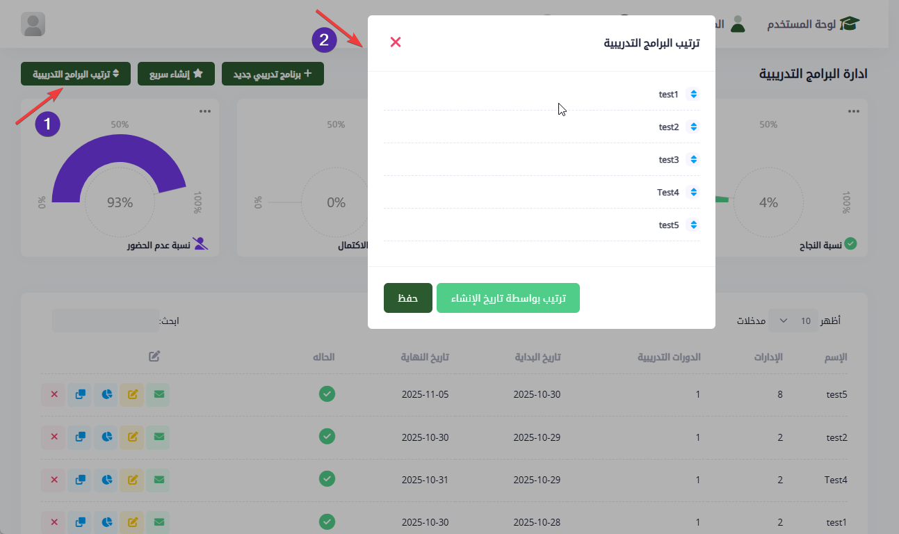 يمكن لمدير النظام سحب أي برنامج تدريب وإفلاته في الموضع الذي يراه مناسبًا داخل القائمة، مما يتيح ترتيبًا يدويًا كاملاً بحسب الأولوية المطلوبة.