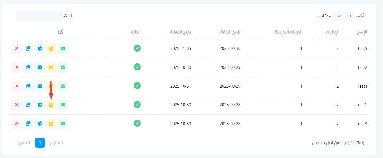 بجانب كل برنامج تدريبي في الجدول توجد مجموعة من الخيارات التي تتيح لمسؤول النظام تنفيذ إجراءات محددة على البرنامج، مثل: