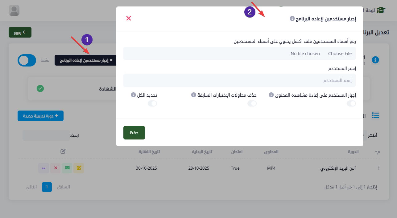 توفر منصة روام ميزة متقدمة تتيح لمدير النظام إجبار المستخدمين على إعادة البرنامج التدريبي، وذلك في الحالات التي تستدعي إعادة التقييم، أو تحديث المحتوى، أو تصحيح محاولات سابقة تساعد هذه الميزة في إعادة ضبط تقدّم المستخدم وتمكين الإدارة من التحكم الكامل في مسار التعلم.