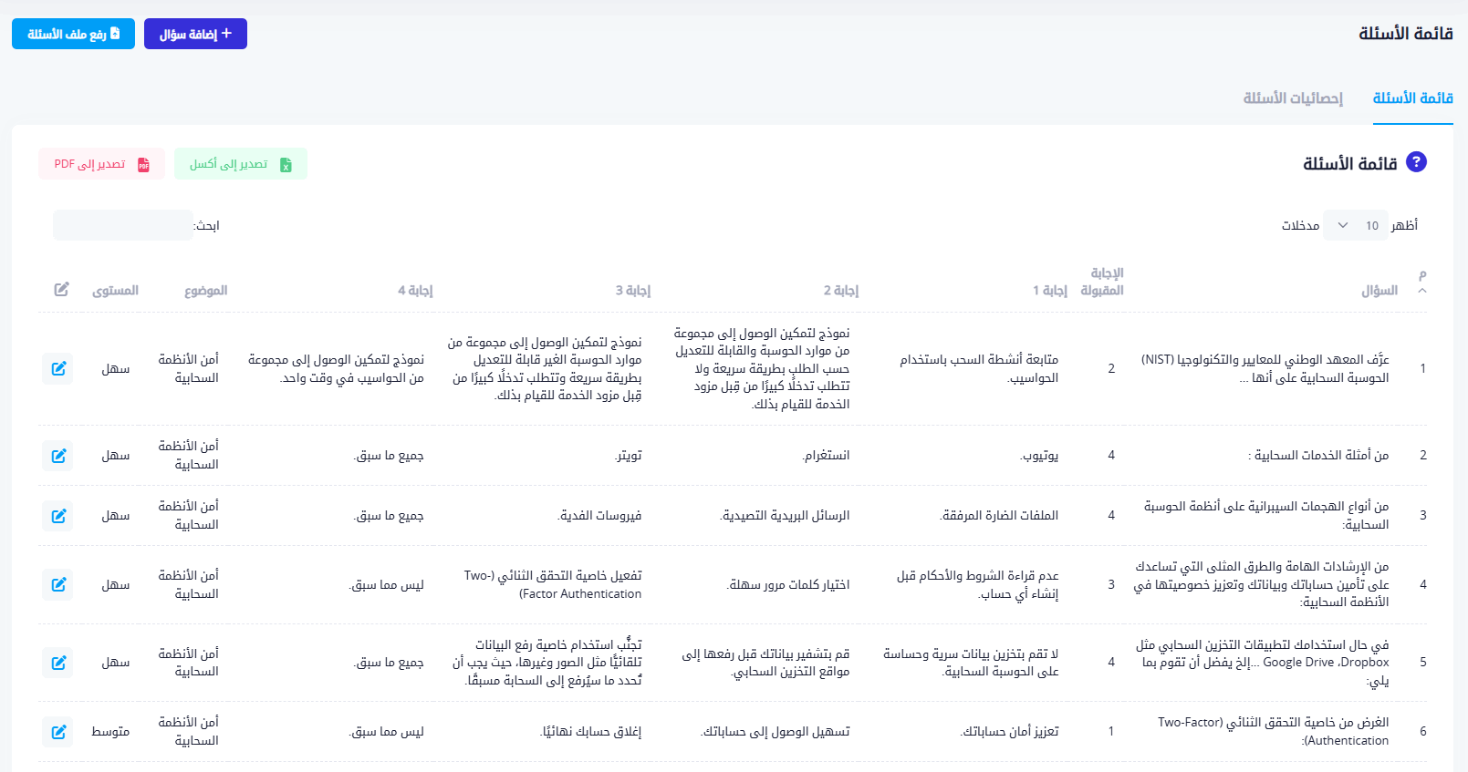 كما يمكن البحث داخل القائمة، أو تصديرها بصيغة PDF أو Excel، مع إمكانية تحديد مجموعة أسئلة لتنفيذ إجراء جماعي عليها.