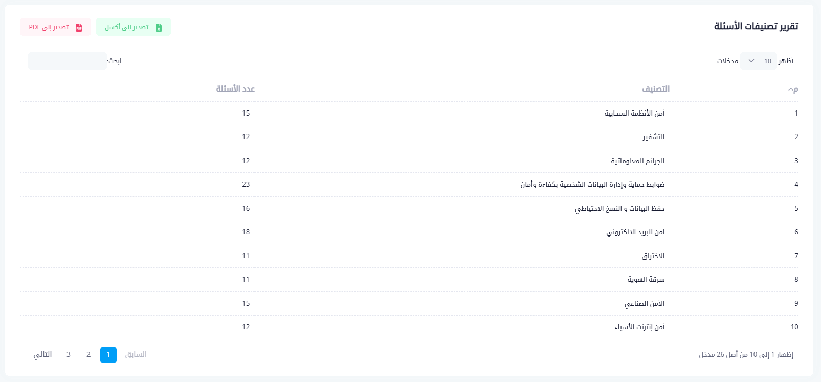 يُظهر هذا التقرير عدد الأسئلة المرتبطة بكل تصنيف أو مجال معرفي داخل البرنامج، مثل: