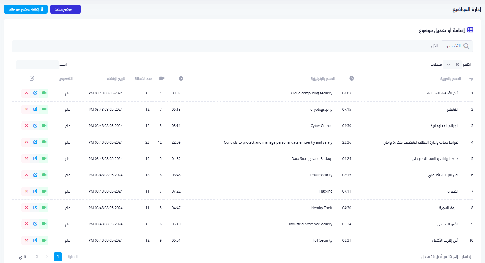 تعرض هذه الشاشة قائمة بجميع المواضيع التدريبية المضافة، مع إمكانية البحث والتصفية والإضافة والتعديل.\nتتضمن الأعمدة: