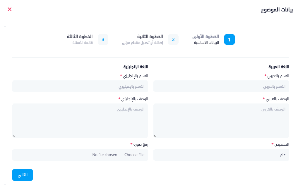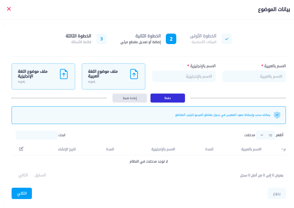 - رفع ملفات الفيديو الخاصة بالموضوع (باللغة العربية والإنجليزية).