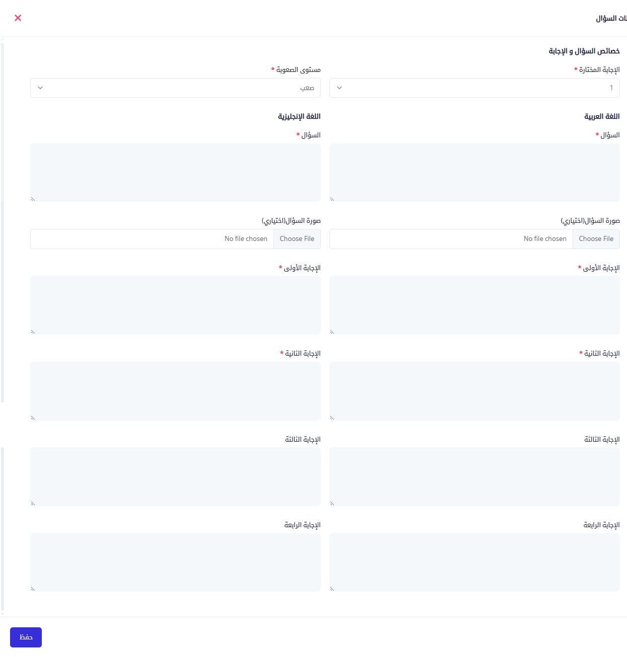 - إدخال السؤال والإجابات (4 إجابات لكل سؤال) باللغتين (العربية والإنجليزية).