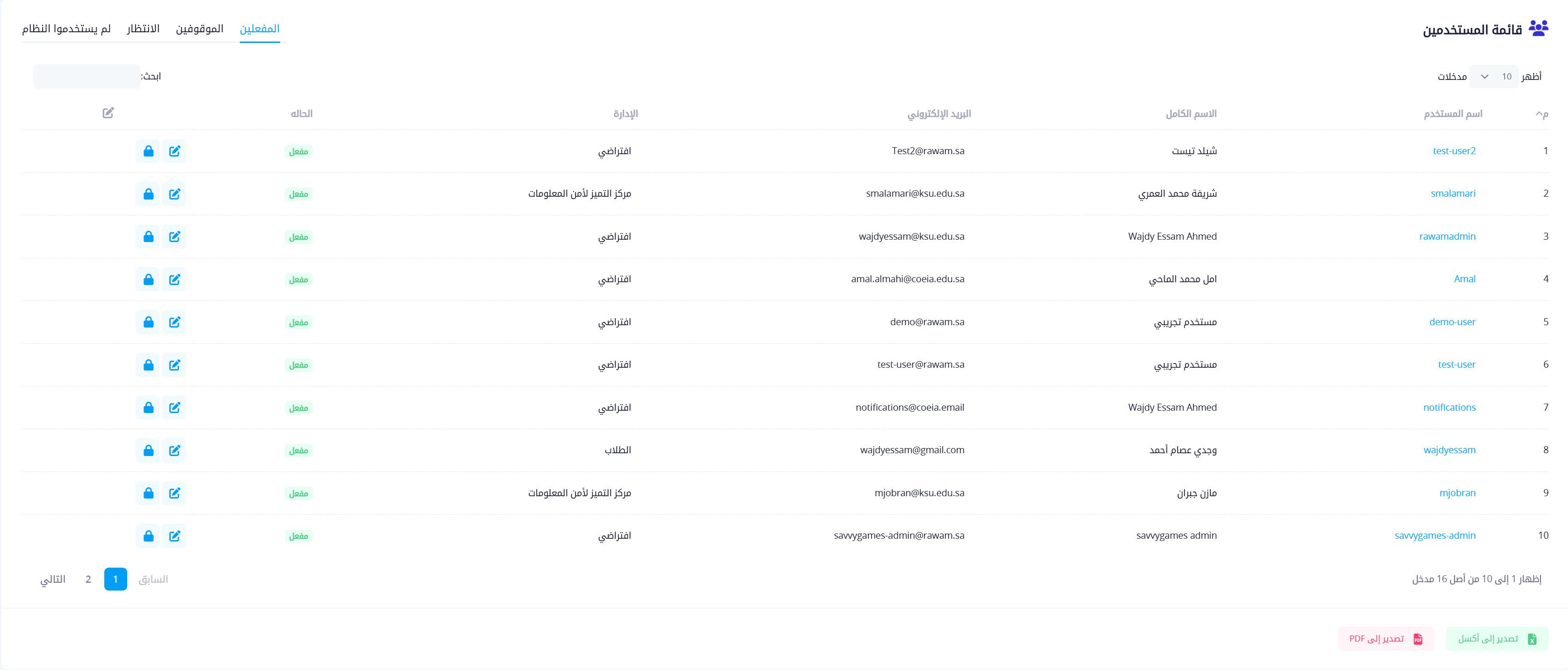 تعرض هذه الصفحة جميع المستخدمين الذين قاموا بتسجيل الدخول إلى نظام روّام ولو لمرة واحدة. يحتوي الجدول على بيانات تعريفية لكل مستخدم، مثل: