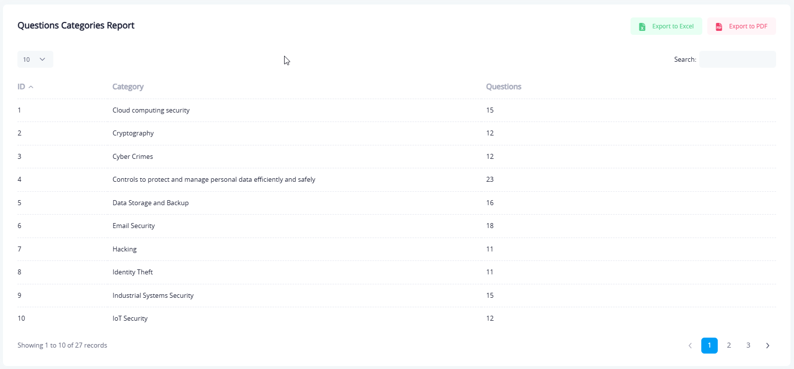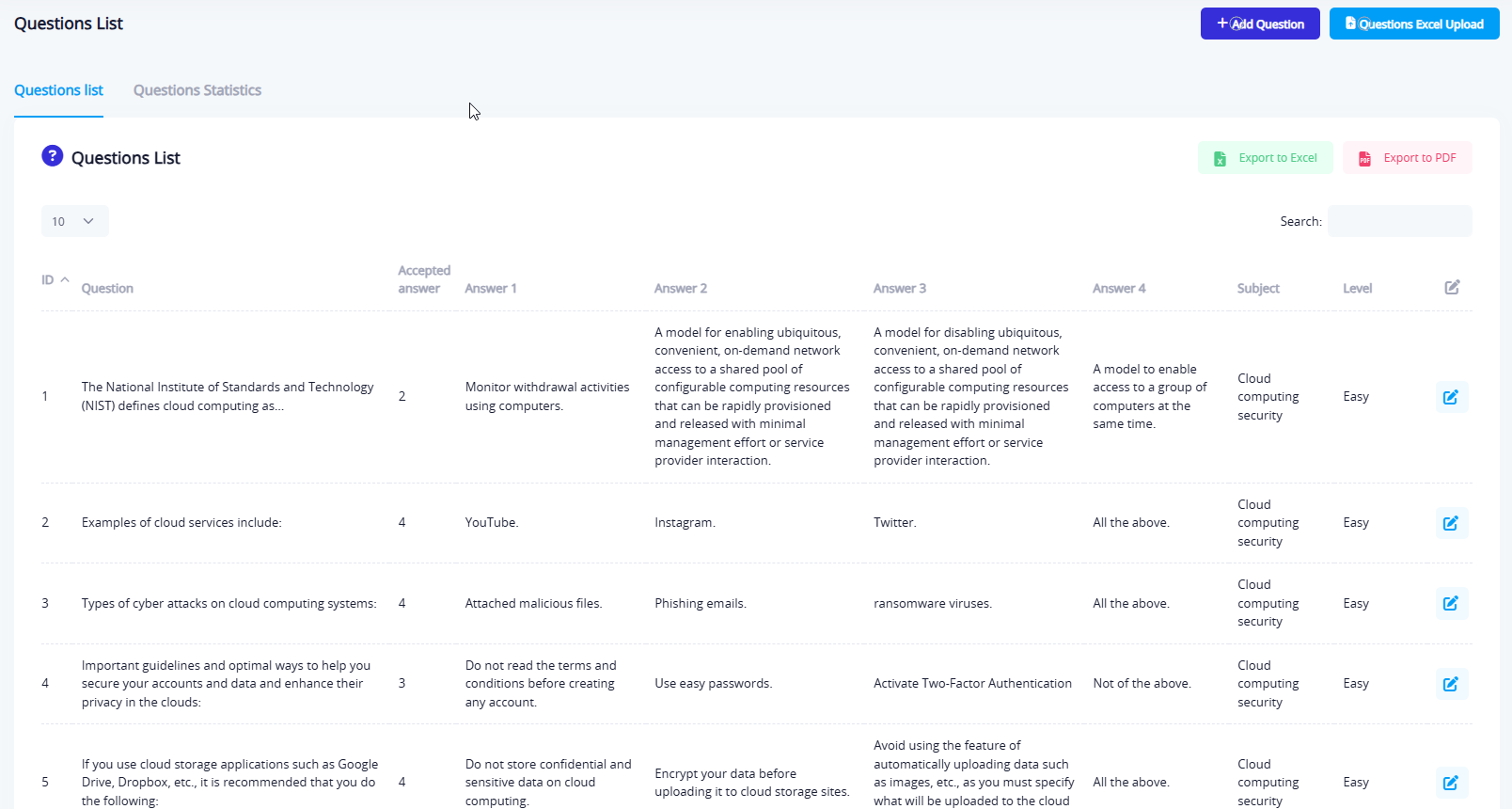 You can also search the list or export it to PDF or Excel, with the ability to select a set of questions for batch operations.