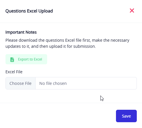 This option allows you to upload a batch of questions at once through an Excel file. The form includes: