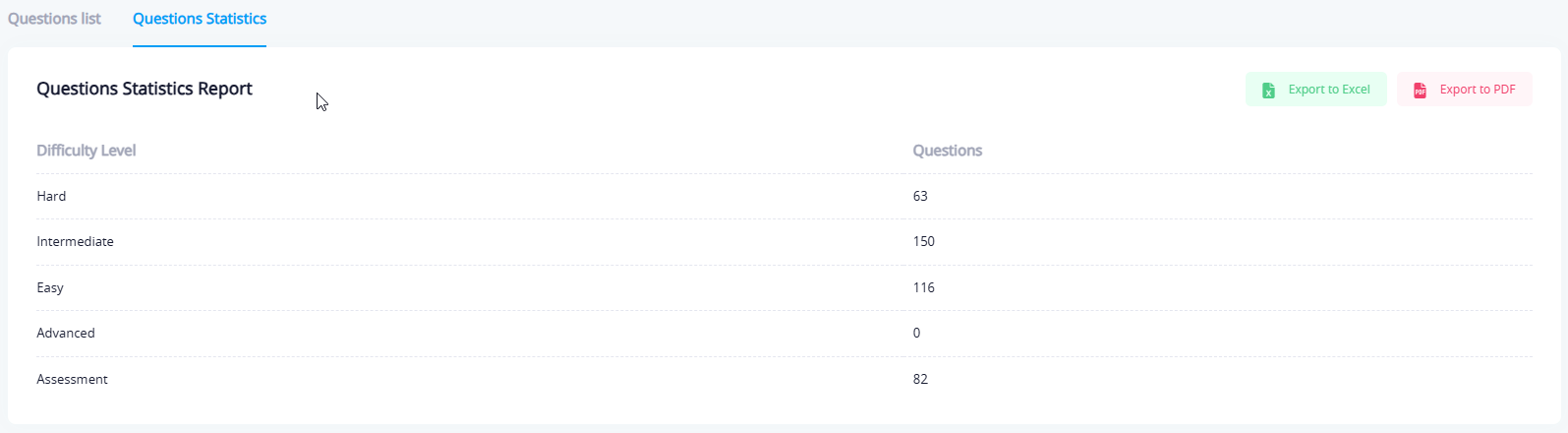 This report displays the distribution of questions by difficulty level, helping to monitor the balance between easy and hard questions. The categories displayed include: